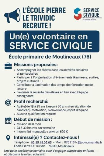 L’école Pierre Le Trividic de Moulineaux recherche un service civique pour l’année scolaire 2025/2026.