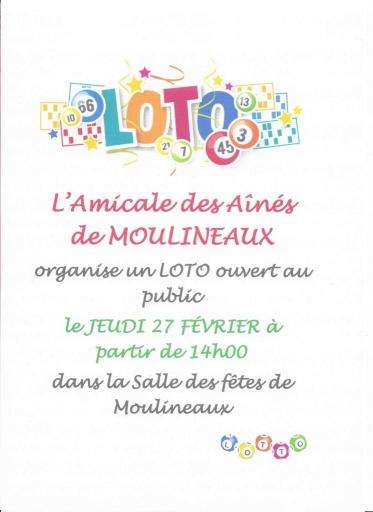 L'Amicale des Aînés de Moulineaux vous invite à passer un agréable après-midi en venant participer à son LOTO.