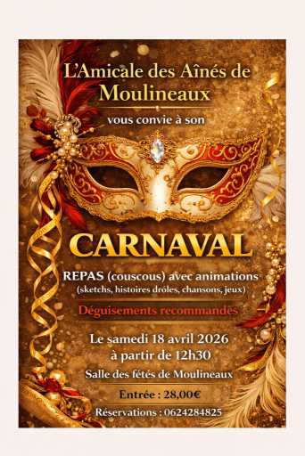L’Amicale des Aînés de Moulineaux organise son « Carnaval » le samedi 18 avril à partir de 12h30 à la salle des fêtes de Moulineaux, ouvert au public.